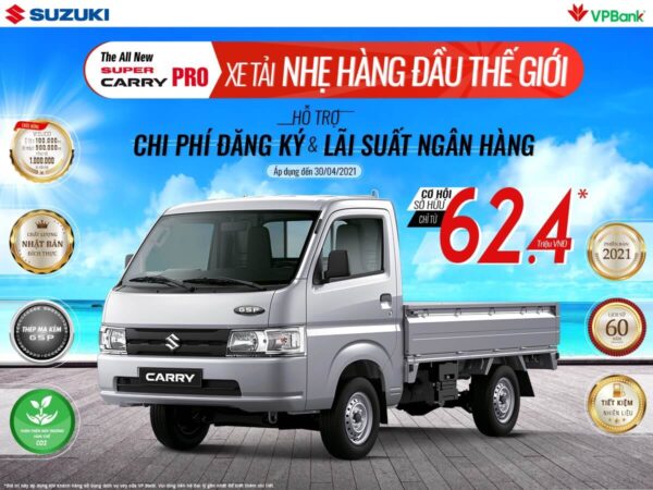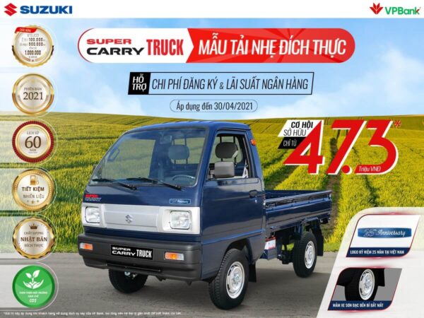 Giờ đây, việc sở hữu xe tải nhẹ Suzuki để bắt đầu công việc kinh doanh cũng dễ dàng hơn bao giờ hết. Chỉ cần trả trước chỉ từ 47,3 triệu và trả góp hàng tháng trung bình 3,1 triệu đồng là khách hàng có thể sở hữu dòng xe Carry Truck với chương trình vay từ VPBank. Tất cả các dòng xe khác của Suzuki Thanh Hoá cũng được hưởng chương trình vay ưu đãi hấp dẫn tương tự.