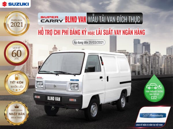 Super Carry Blind Van là mẫu xe tải nhẹ quen thuộc với người tiêu dùng Việt trong suốt 25 năm qua nay cũng được “khoác áo mới” với tem kỷ niệm 25 năm tại Việt Nam. Dòng xe tải nhẹ với động cơ Suzuki F10 – kiệt tác công nghệ động cơ được số đông người dùng ưa chuộng bởi khả năng linh hoạt, bền bỉ.
