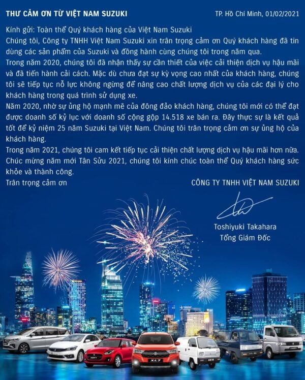 Năm 2020, nhờ sự ủng hộ mạnh mẽ của đông đảo khách hàng, chúng tôi mới có thể đạt được doanh số kỷ lục với doanh số cộng gộp 14.518 xe bán ra. Đây thực sự là kết quả tốt để kỷ niệm 25 năm Suzuki tại Việt Nam. Chúng tôi trân trọng cảm ơn sự ủng hộ của khách hàng.