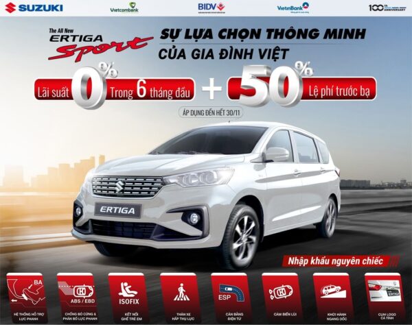 | Ertiga Sport | Hỗ trợ lãi suất vay 0% trong 6 tháng đầu tiên & 50% lệ phí trước bạ, tương đương 40.000.000 VNĐ |
