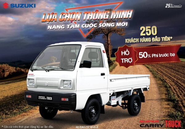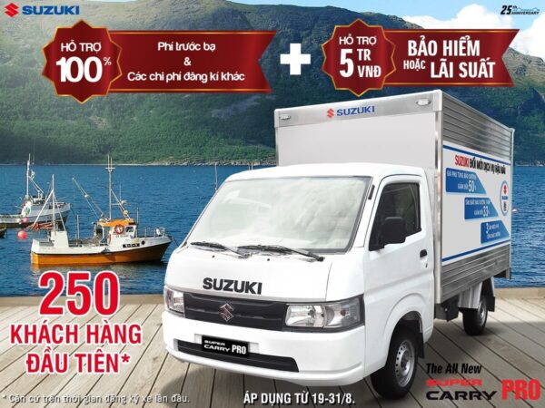 Tháng 8 này, 250 khách hàng đầu tiên* mua xe Super Carry Pro sẽ được hỗ trợ 100% thuế trước bạ và phí đăng ký (tương đương 10 triệu đồng), bảo hiểm hoặc hỗ trợ lãi suất tương đương 5 triệu đồng. Tổng giá trị hỗ trợ 15 triệu đồng.