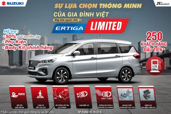 Ertiga Limited là mẫu xe MPV được yêu thích của nhiều gia đình và nhà kinh doanh bởi độ an toàn và không gian rộng rãi, thoải mái. Nhân dịp kỷ niệm cột mốc 25 năm tại Việt Nam, 250 khách hàng đầu tiên* trong thời gian khuyến mãi mua Ertiga Limited và hoàn tất thủ tục đăng ký xe sẽ được Suzuki hỗ trợ 50% thuế trước bạ, phụ kiện, Body Kit chính hãng trị giá 28 triệu hoặc tiền mặt 14 triệu đồng. Tổng giá trị là 60 triệu đồng nếu khách hàng chọn được hỗ trợ phụ kiện. Đây là cơ hội cuối cùng để mua Ertiga Limited với chương trình ưu đãi hấp dẫn.