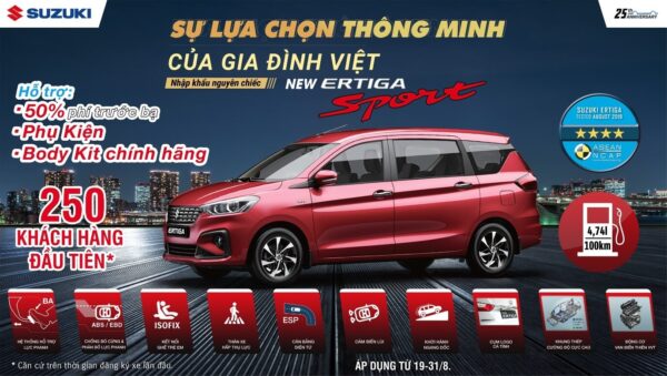 Tháng 8, Suzuki hỗ trợ 50% thuế trước bạ, và tùy chọn bodykit chính hãng trị giá 28 triệu đồng hoặc tiền mặt 14 triệu đồng cho 250 khách hàng đầu tiên* mua Ertiga Sport và hoàn thành thủ tục đăng ký xe trong thời gian khuyến mãi. Tổng giá trị hỗ trợ là 56 triệu đồng nếu khách hàng chọn phụ kiện.