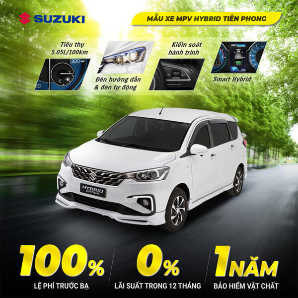 Ưu đãi cao nhất được áp dụng cho mẫu Hybrid Ertiga. Trong phân khúc MPV hiện nay, Hybrid Ertiga vẫn là mẫu xe duy nhất sở hữu công nghệ Hybrid, đồng thời có thêm một số tính năng đắt giá như ga tự động (Cruise Control), đèn pha tự động, màn hình hiển thị đa thông tin 10 inch lớn nhất phân khúc hay tính năng ngắt động cơ tạm thời. Với mức ưu đãi 100% lệ phí trước bạ, 0% lãi suất trong 12 tháng và 1 năm bảo hiểm vật chất, Hybrid Ertiga trở thành lựa chọn tối ưu nhất về giá sau khi được hỗ trợ tổng cộng lên đến 100 triệu đồng.